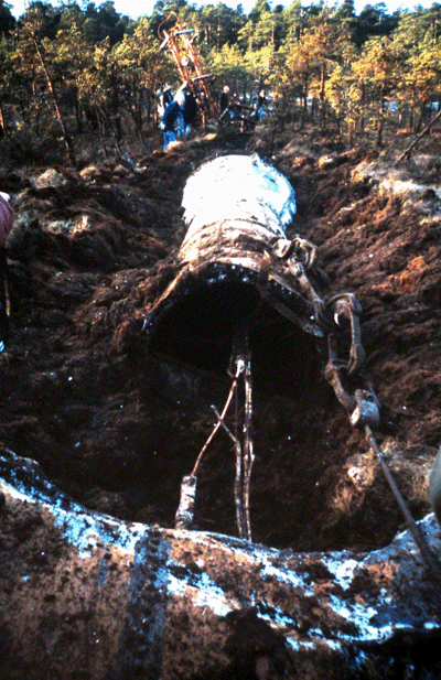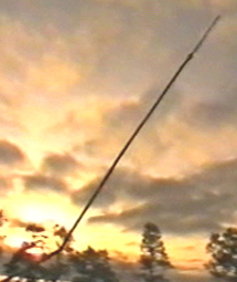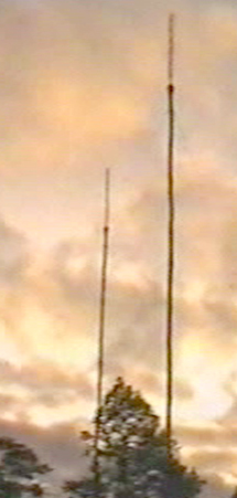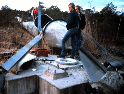 mäktig som masten från 1965. När masterna föll hördes ett spöklikt klagovrål eka över skogen när metallen förvreds under fallet. Hur smäckra de än såg ut när de var resta var godstjockleken hela 8mm i de stålrördelar som masten bestod av, och vikten 100 ton per mast. Längden per mast var 160m + toppspirans 32m, totalt 192m. |