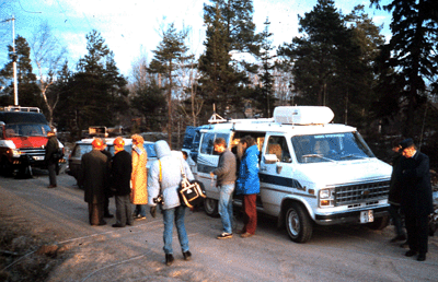 ![]() Radio Stockholms sändningsbuss har anlänt tidigt på morgonen. Reportern Lotta Johansson syns i gul kappa. Längre bort i bild syns Televerket Radios bil med antenn riktad mot Klara där Radio Stockholm då hade sin adress. Hör Radio Stockholms direktsändning Förutom Lotta Johansson hörs från studion i Klara Agneta Askelöf.