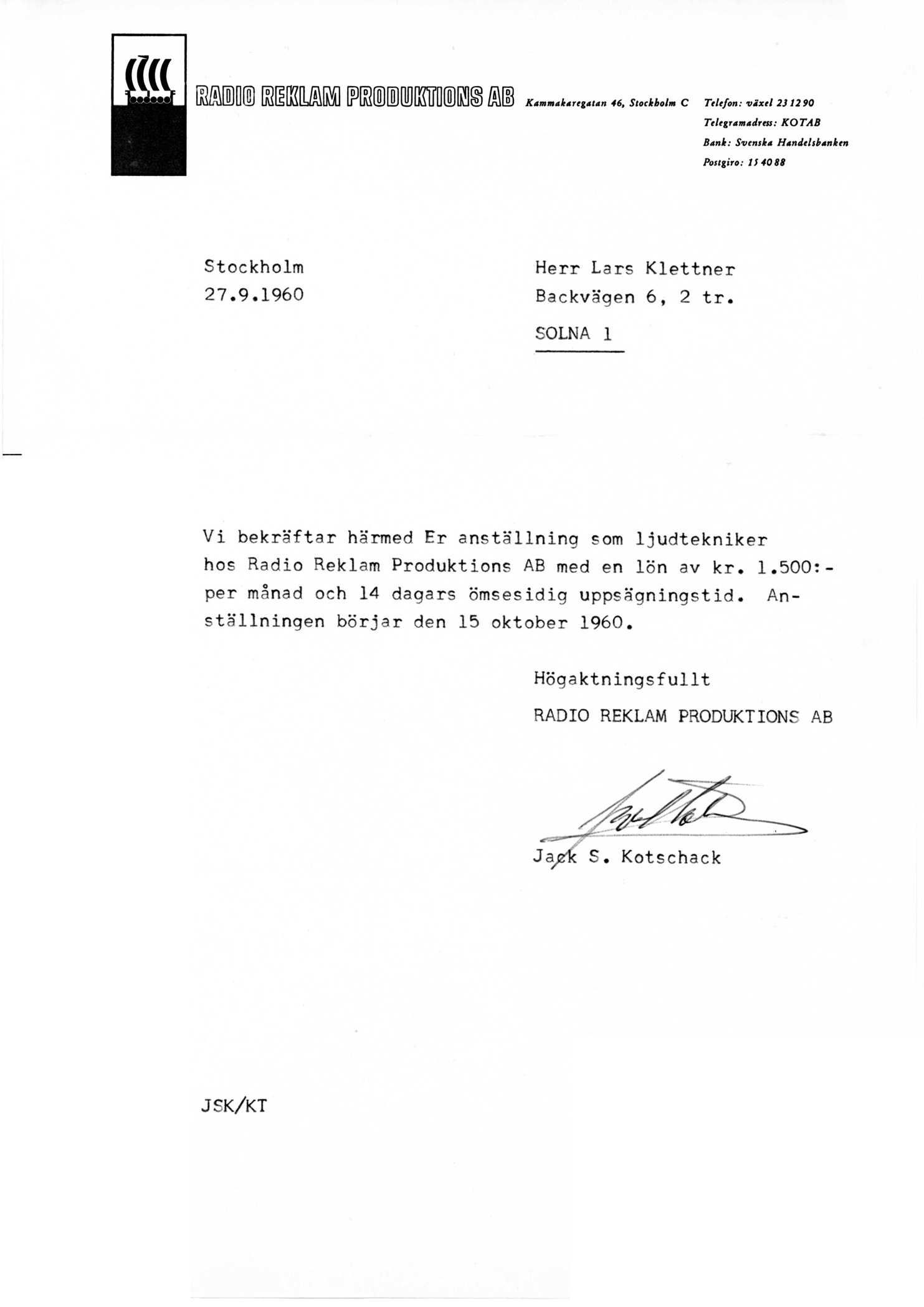 Nord den 15 oktober 1960 - se hans anställningsbevis