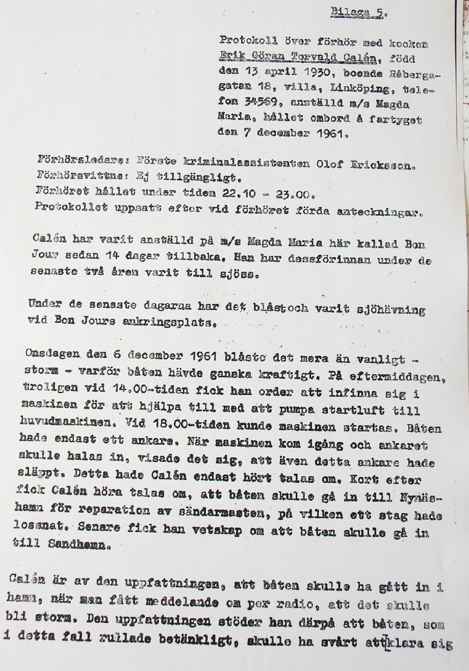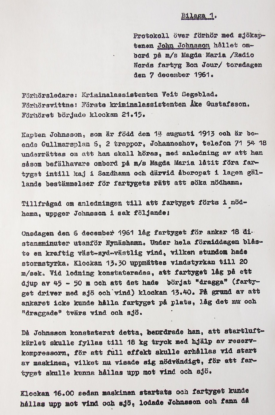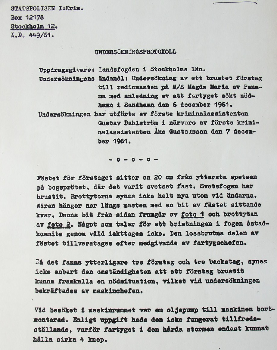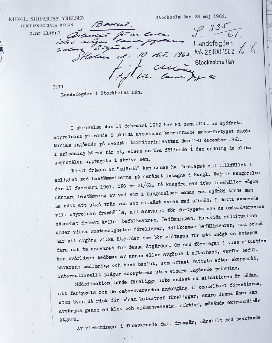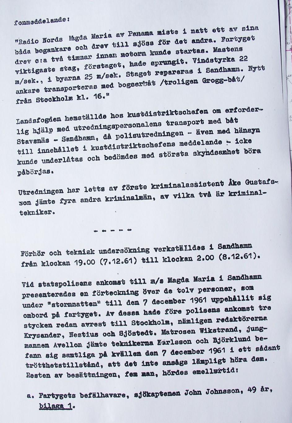 BON JOURS NÖDLÄGE I STORMEN På den här sidan återges dokument från den förundersökning som gjordes hos Landsfogden i Stockholms län efter L. Lindelöws initiativ. Syftet med undersökningen var att fastställa om Radio Nords sändarfartyg M/S "Bon Jour" (egentligen Magda Maria) hade giltiga skäl för att göra gällande att den så kallade nödhamnsparagrafen skulle ha gällt i fallet när hon sökte nödhamn den 6-7 december 1961
