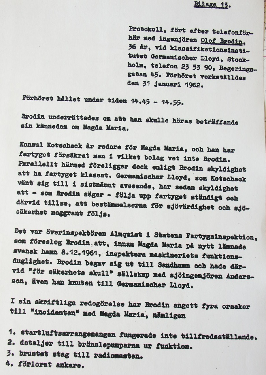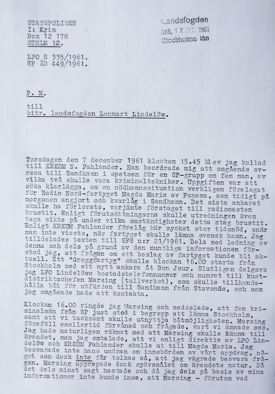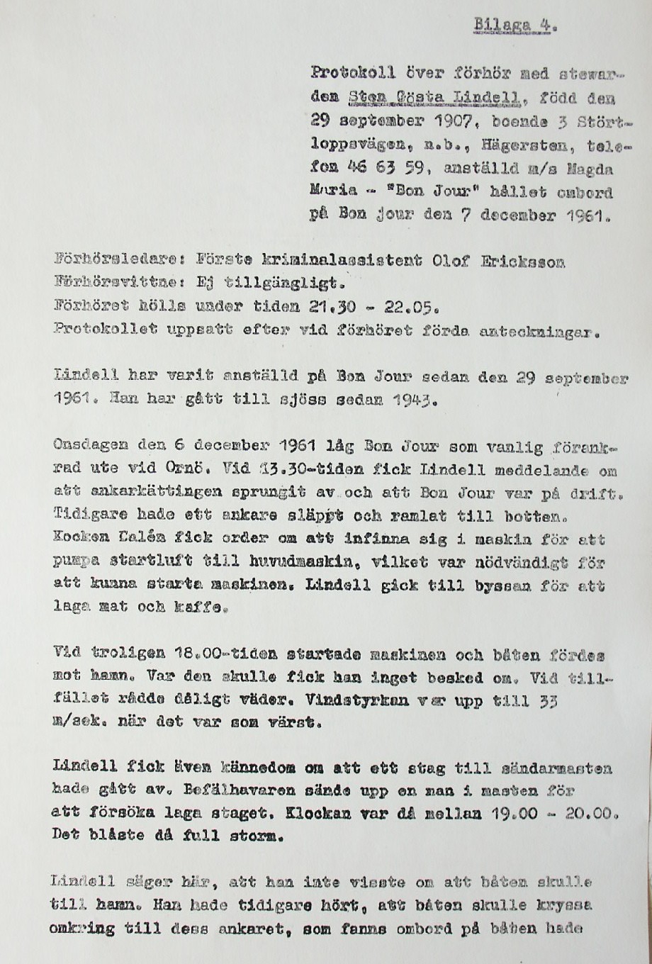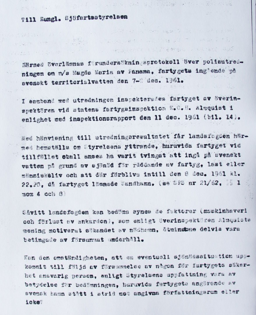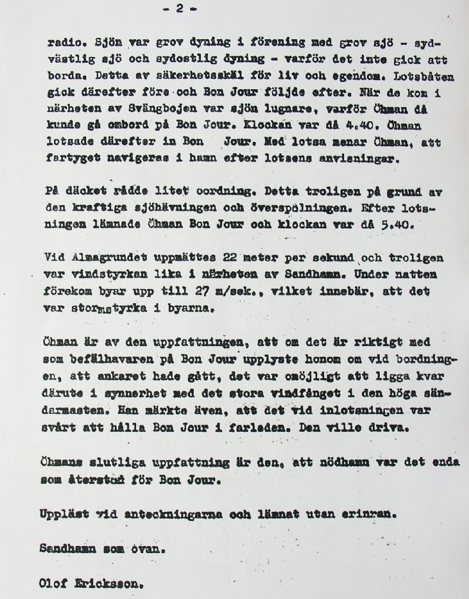 BON JOURS NÖDLÄGE I STORMEN På den här sidan återges dokument från den förundersökning som gjordes hos Landsfogden i Stockholms län efter L. Lindelöws initiativ. Syftet med undersökningen var att fastställa om Radio Nords sändarfartyg M/S "Bon Jour" (egentligen Magda Maria) hade giltiga skäl för att göra gällande att den så kallade nödhamnsparagrafen skulle ha gällt i fallet när hon sökte nödhamn den 6-7 december 1961