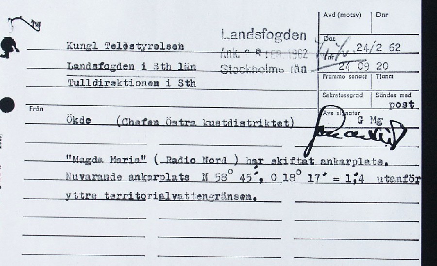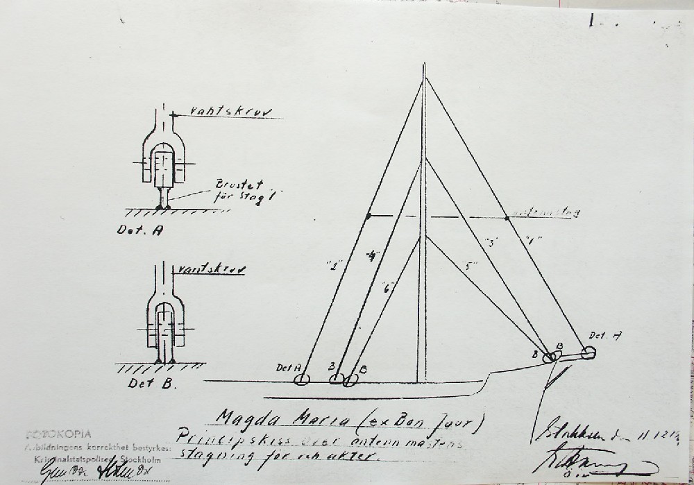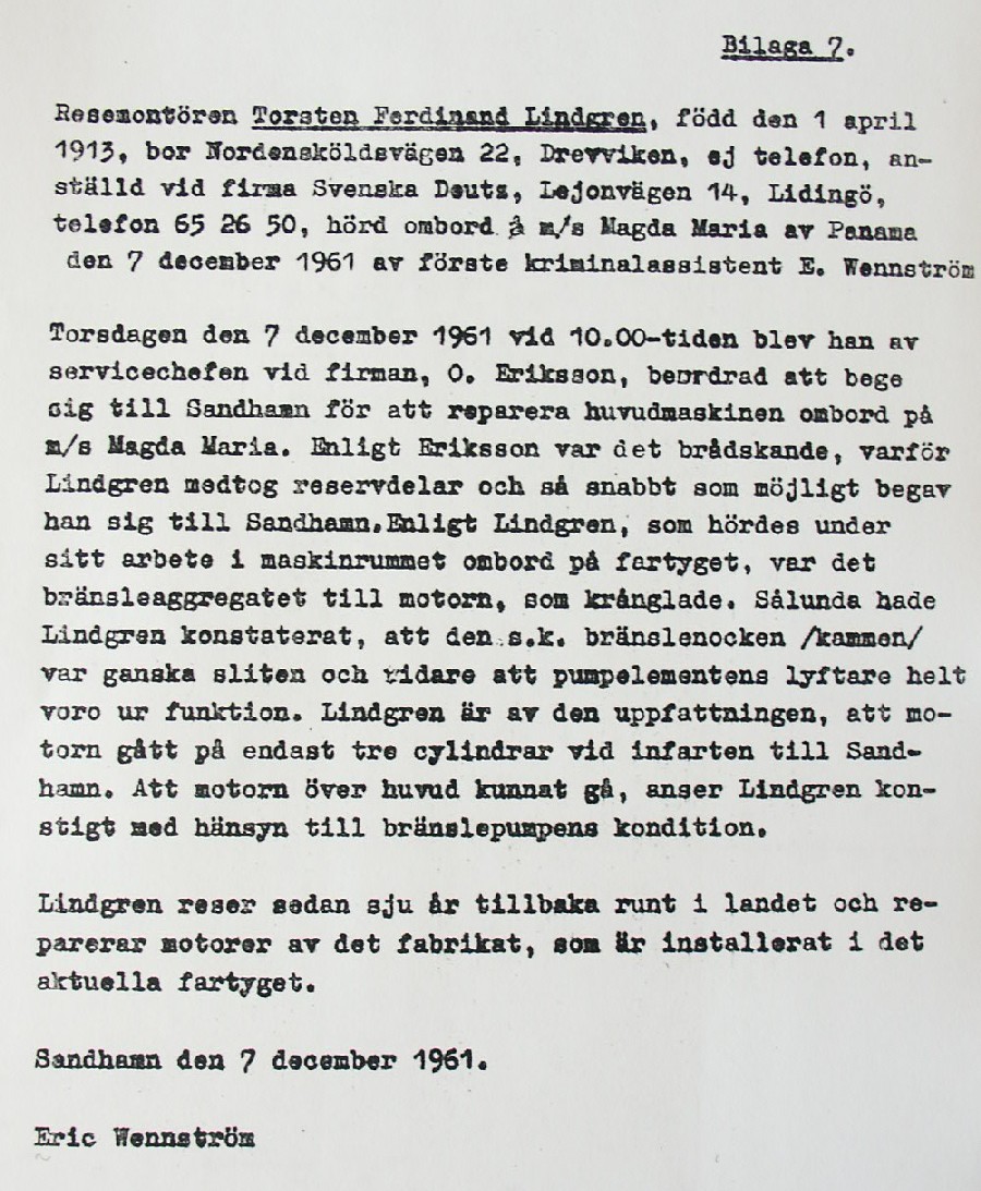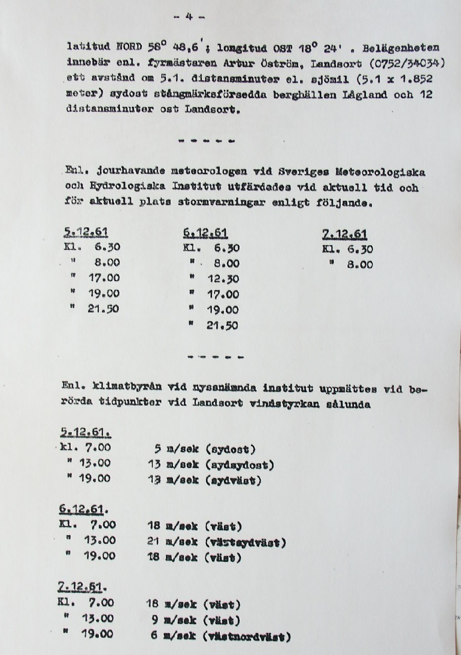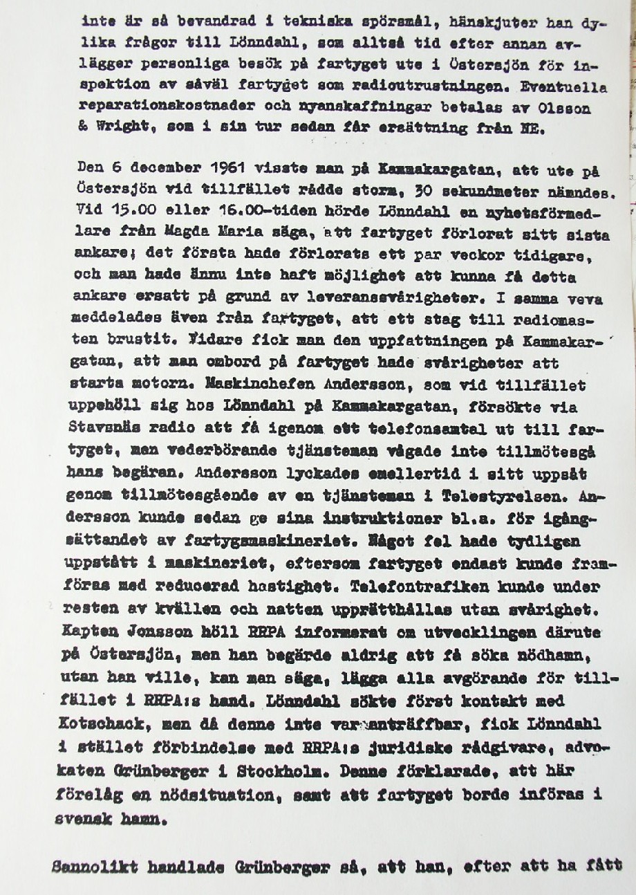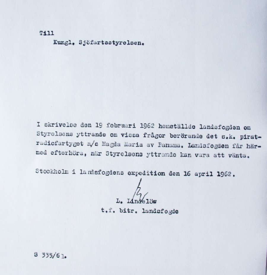 BON JOURS NÖDLÄGE I STORMEN På den här sidan återges dokument från den förundersökning som gjordes hos Landsfogden i Stockholms län efter L. Lindelöws initiativ. Syftet med undersökningen var att fastställa om Radio Nords sändarfartyg M/S "Bon Jour" (egentligen Magda Maria) hade giltiga skäl för att göra gällande att den så kallade nödhamnsparagrafen skulle ha gällt i fallet när hon sökte nödhamn den 6-7 december 1961
