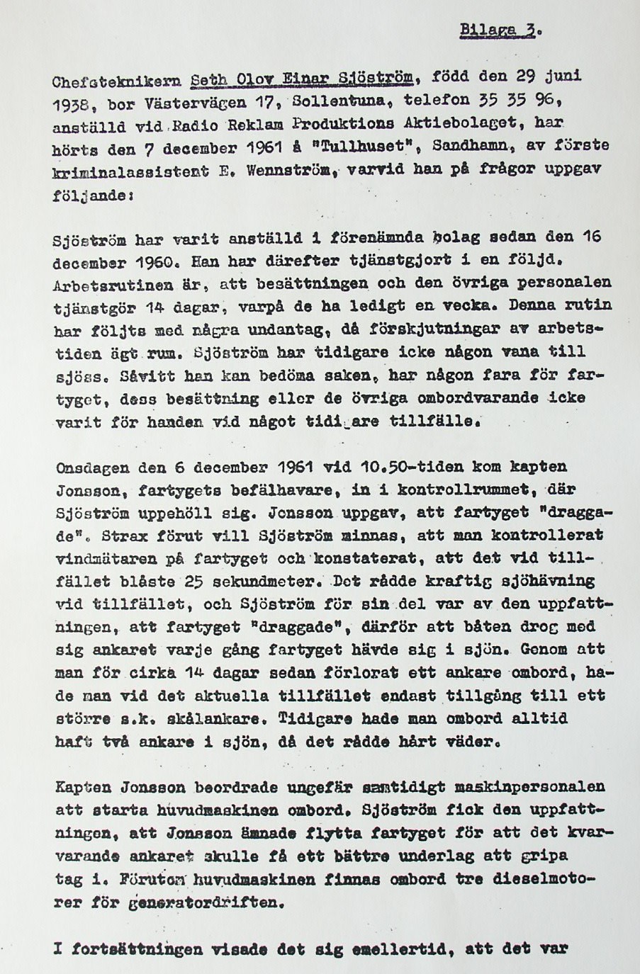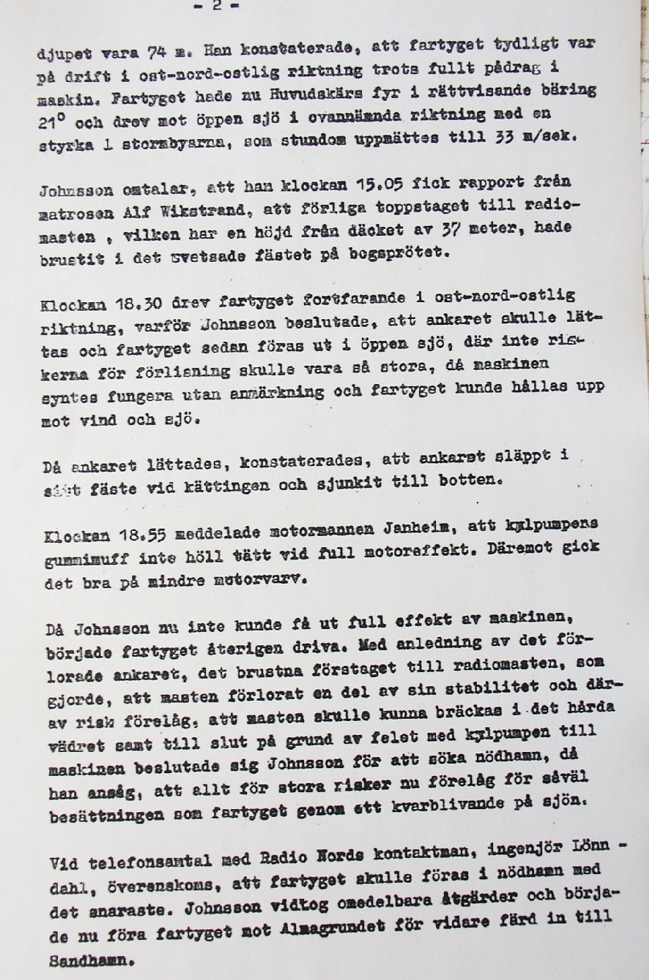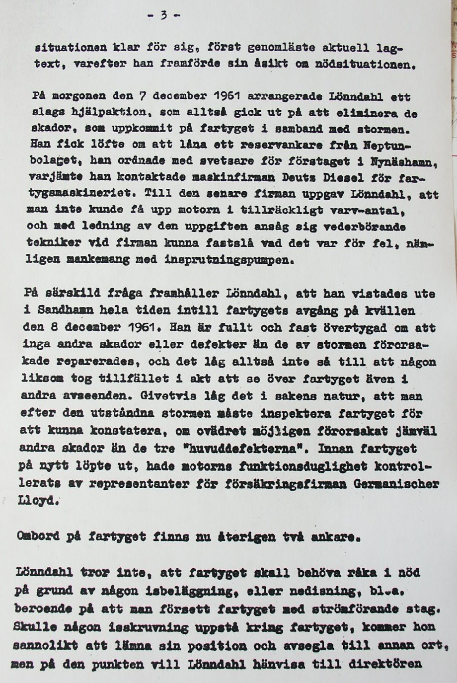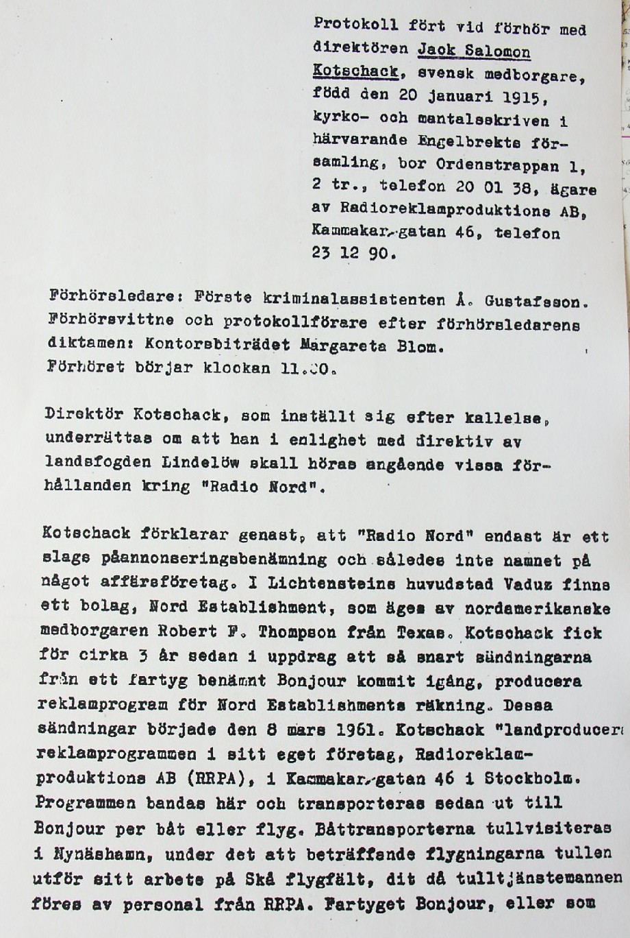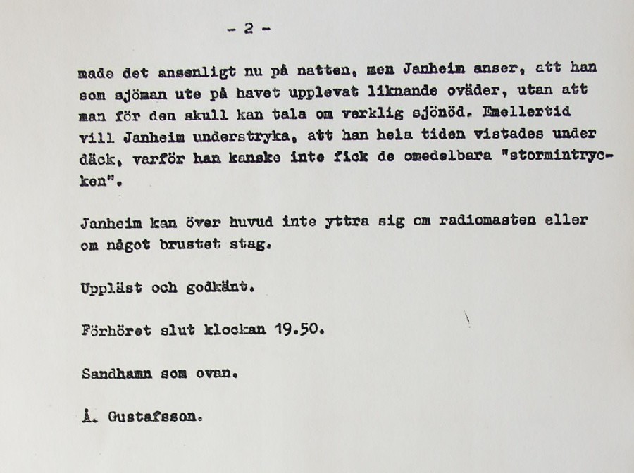 BON JOURS NÖDLÄGE I STORMEN På den här sidan återges dokument från den förundersökning som gjordes hos Landsfogden i Stockholms län efter L. Lindelöws initiativ. Syftet med undersökningen var att fastställa om Radio Nords sändarfartyg M/S "Bon Jour" (egentligen Magda Maria) hade giltiga skäl för att göra gällande att den så kallade nödhamnsparagrafen skulle ha gällt i fallet när hon sökte nödhamn den 6-7 december 1961